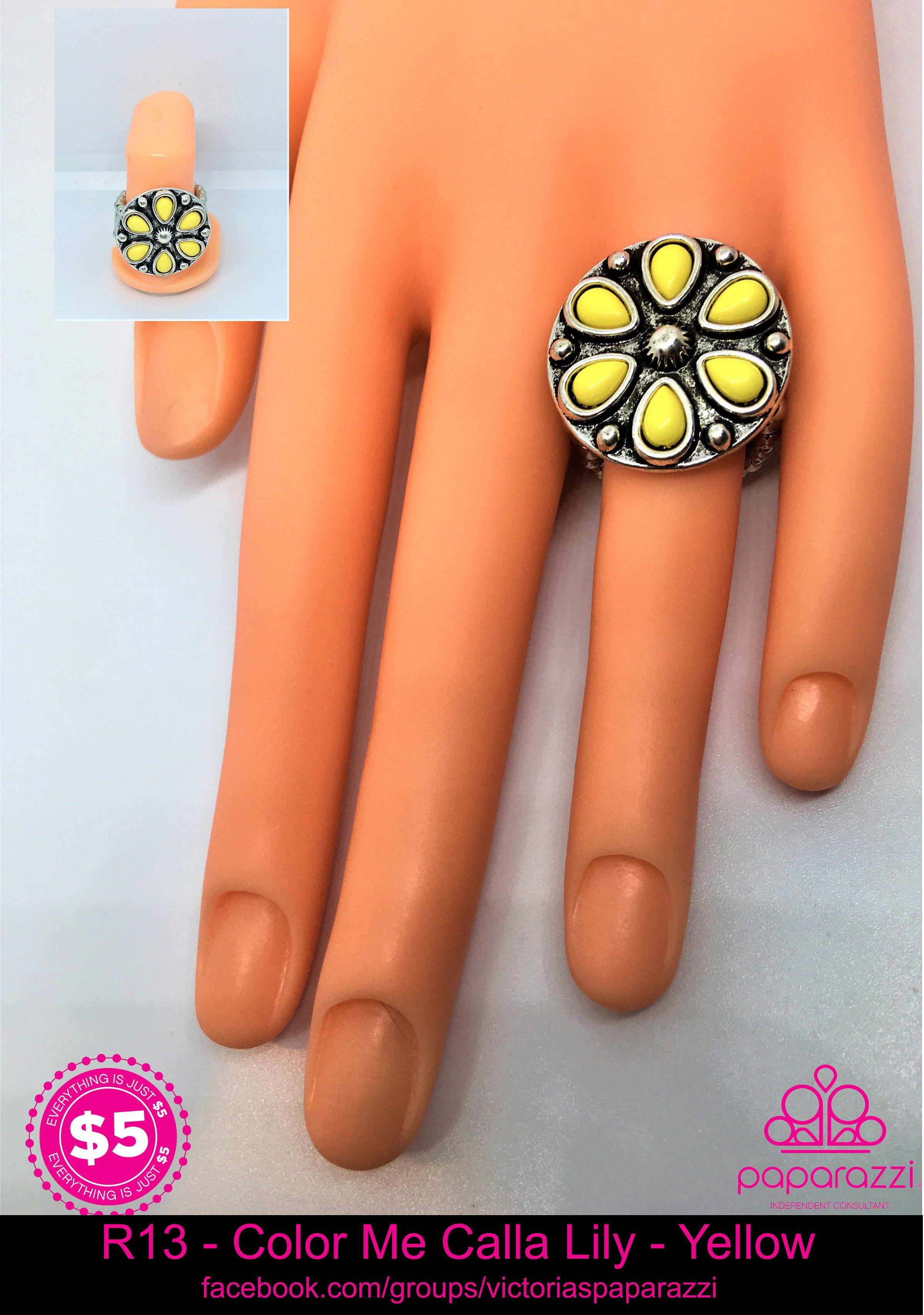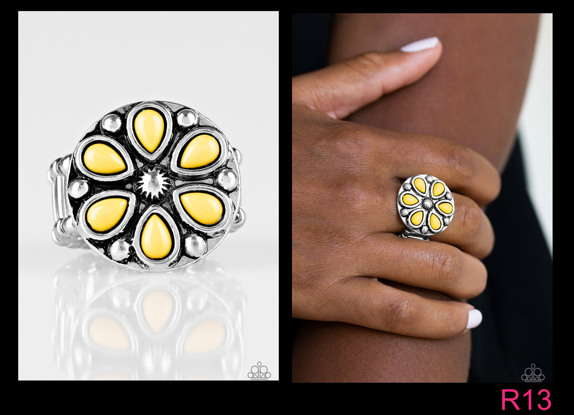 Sunny yellow beads are pressed into a studded silver frame, creating a colorful floral centerpiece atop the finger. Features a stretchy band for a flexible fit.