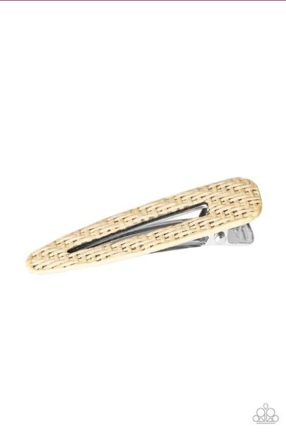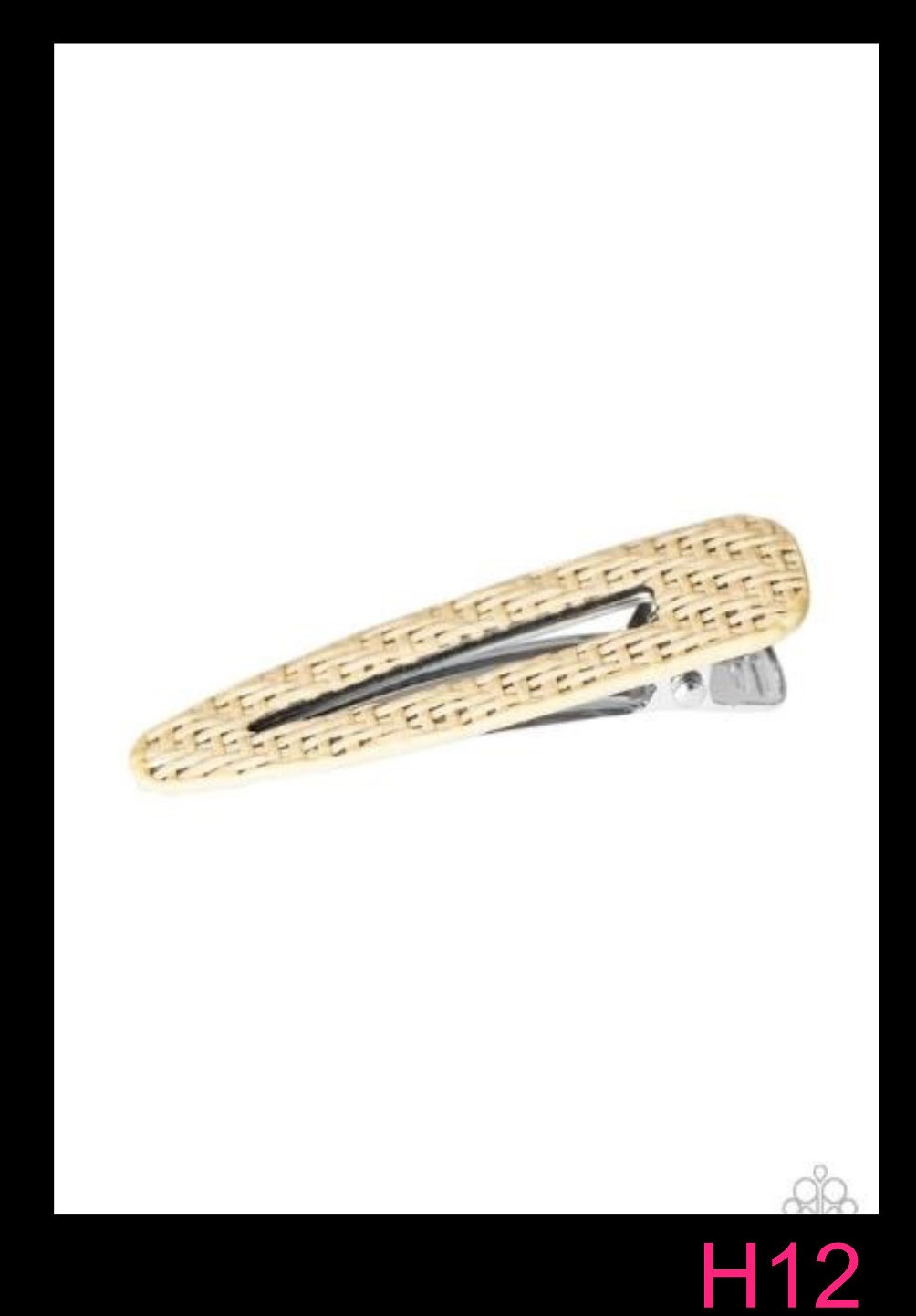 Brown twine-like cording weaves across the front of a silver frame, creating a wicker-like pattern for a rustic flair. Features a standard hair clip. Sold as one individual hair clip.